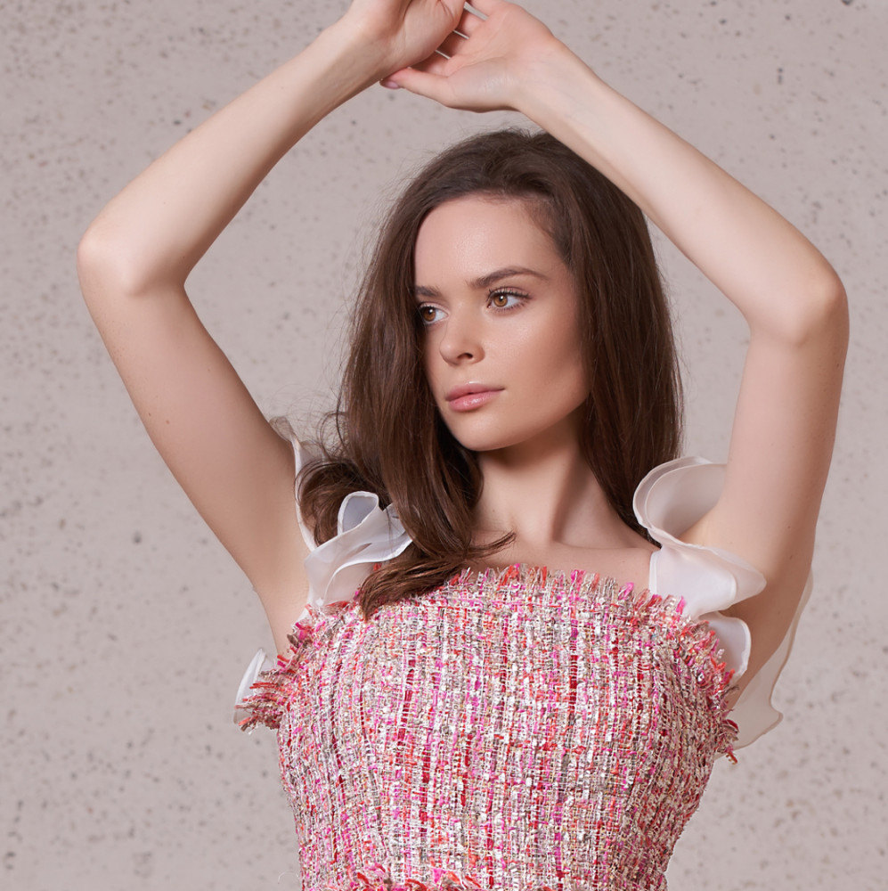 فستان مصنوع من مزيج من التويد والأورجانزا يتميز بفتحة صدر مربعة وبأكمام قصيرة من الأورجانزا وتنورة واسعه منسلة الاطراف.