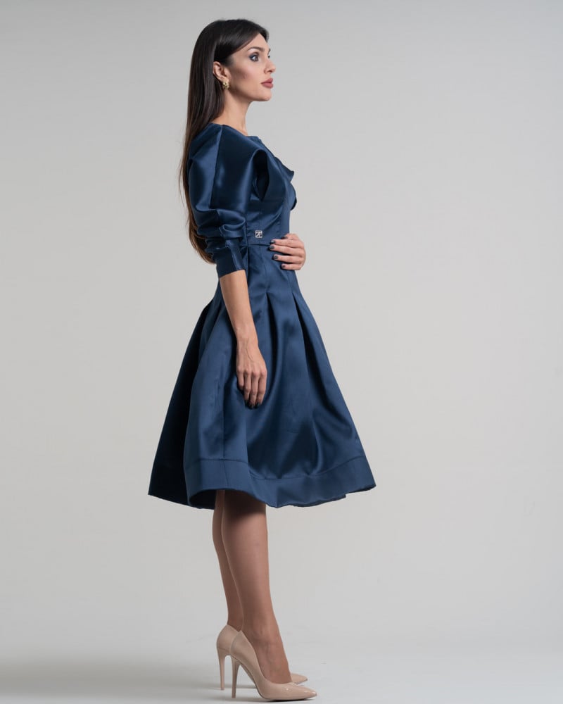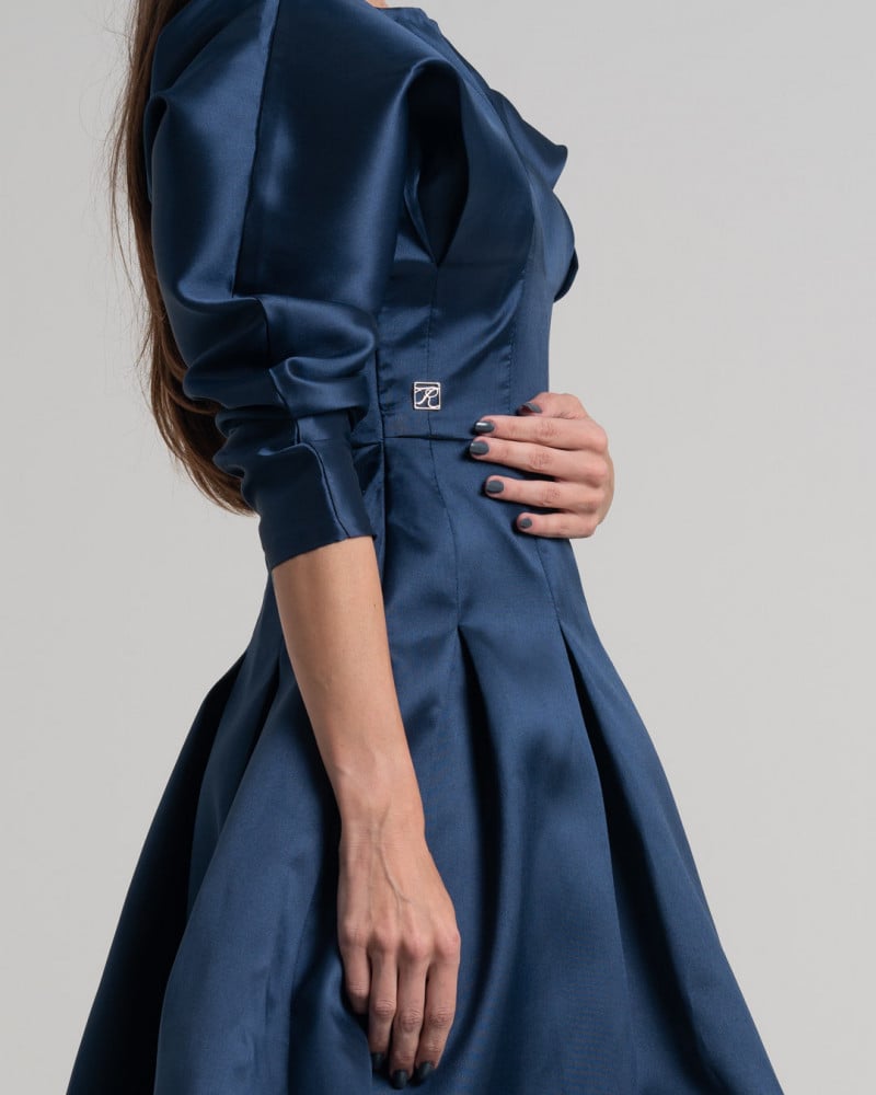 فستان مصنوع من التفته يتميز باكتاف بارزة وبكسرات في الصدر وفي التنورة.تفاصيل التصميم:• اللون: أزرق• طول الفستان 101cm / 40in• حافة من الجيبون• سحّاب في الخلف• تنظيف جاف