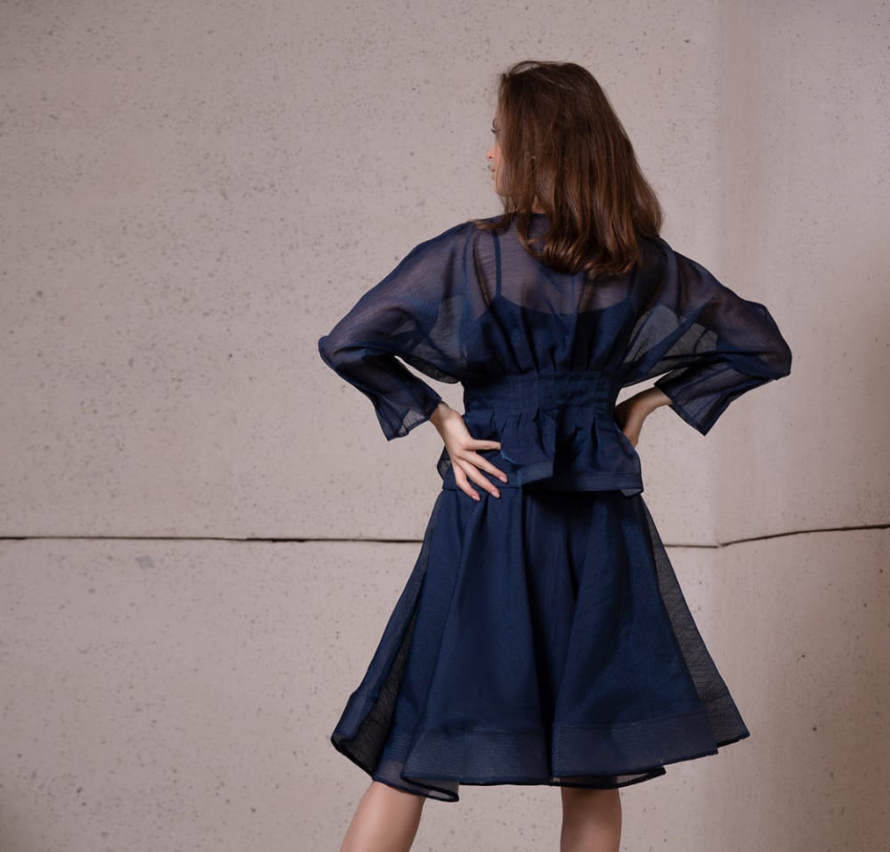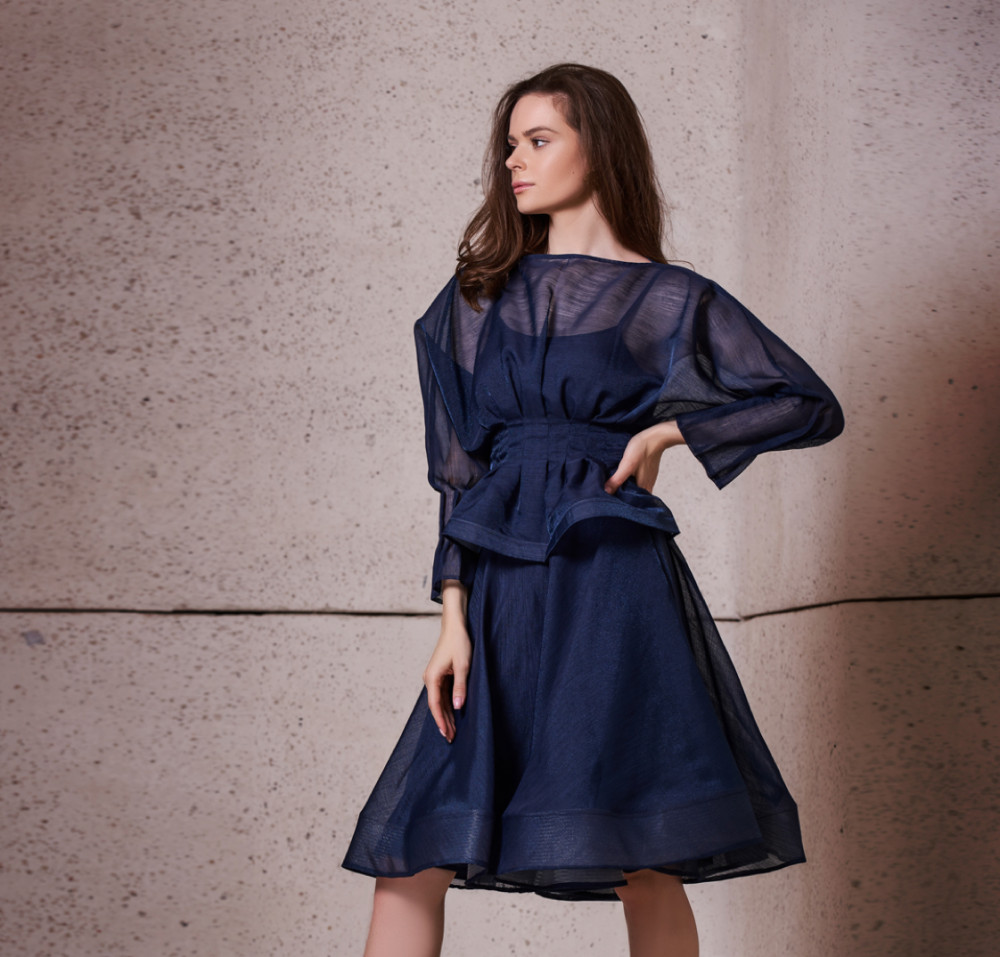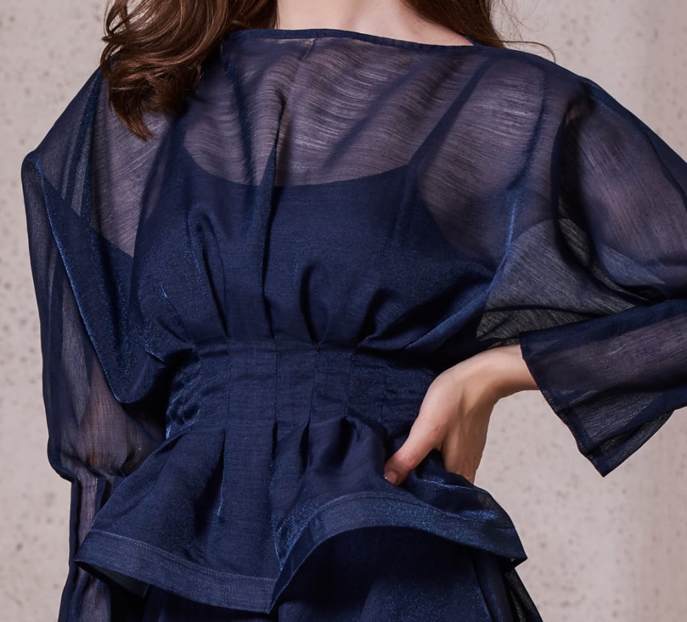 طقم مصنوع من الأورجانزا المقلم يتميز بفتحة صدر مرتفعة وكسرات في الخصر تنورة واسعة.تفاصيل التصميم:• اللون: أزرق • طول البلوزة 56cm / 22in• طول التنورة 61cm / 24in• حافة من الجيبون• سحّاب في الخلف• تنظيف جاف