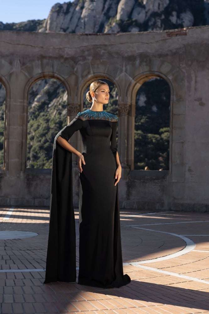 An elegant black long dress embellished with handmade turquoise beads and crystals on the neck and shoulders by skilled craftsmen, with long cap sleeves that reach the floor. This dress is distinguished by its tight fit on the body in the chest and waist area, which highlights the beauty of the wearer’s figure on formal occasions and parties.