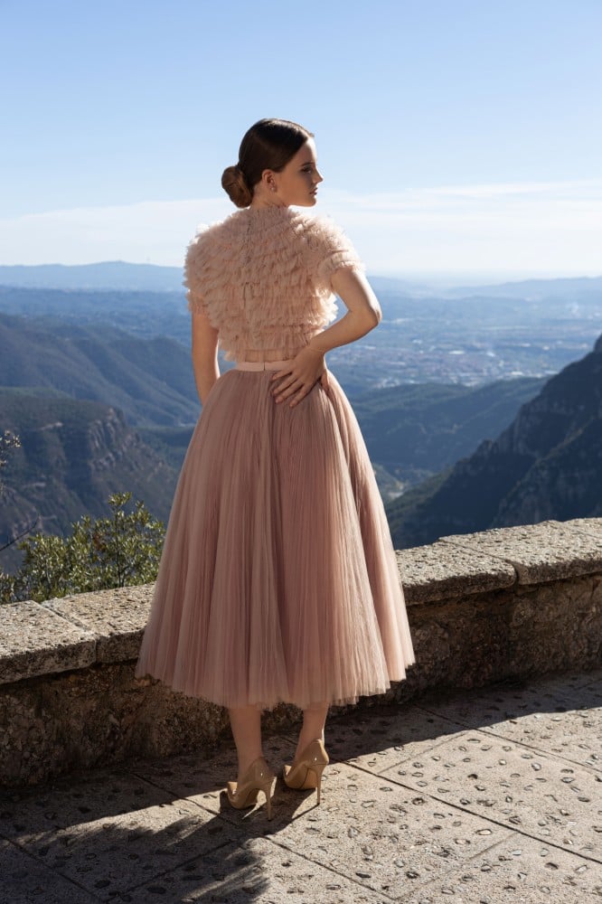 A tulle blouse and skirt with its unique elegance and femininity. The blouse is characterized by small pleats of tulle and short sleeves, while the skirt is wide with layers of dense tulle in a midi length, which adds volume and beautiful movement when moving.